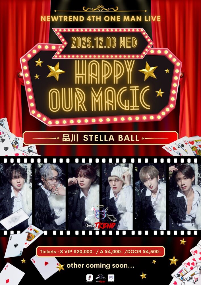 NEWTREND 4th ONE MAN LIVE SCHEDULE 2025/12/03(水) 品川ステラボール 『NEWTREND 4th ONE MAN LIVE Happy Our Magic』 ▷12/3(水) ▷品川ステラボール ▷OPEN17:00 / START18:00 ▷チケット情報 S VIP ¥20,000-(前方3列100席限定) Aチケット ¥4,000- チケットの購入、詳細はこちら▽ newtrend-fc.bitfan.id/contents/296222 URLをコピーする 報告する