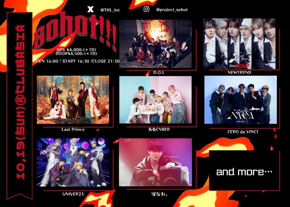 Sohot!!! SCHEDULE 2025/10/19(日) 渋谷 clubasia 『Sohot!!!』 ▷10/19(日) ▷渋谷 clubasia ▷OPEN16:00/START16:30/CLOSE21:30 ▷前売り¥4,000/当日¥4,500(1D別) ⚠︎タイムテーブルは後日公開 チケットの購入はこちら▽ t.livepocket.jp/e/sohot1019 【先行チケット(抽選)】 9/6(土)21:00〜9/14(日)23:59 【一般チケット(先着)】 9/23(火)23:10〜 ※チケット販売開始 URLをコピーする 報告する