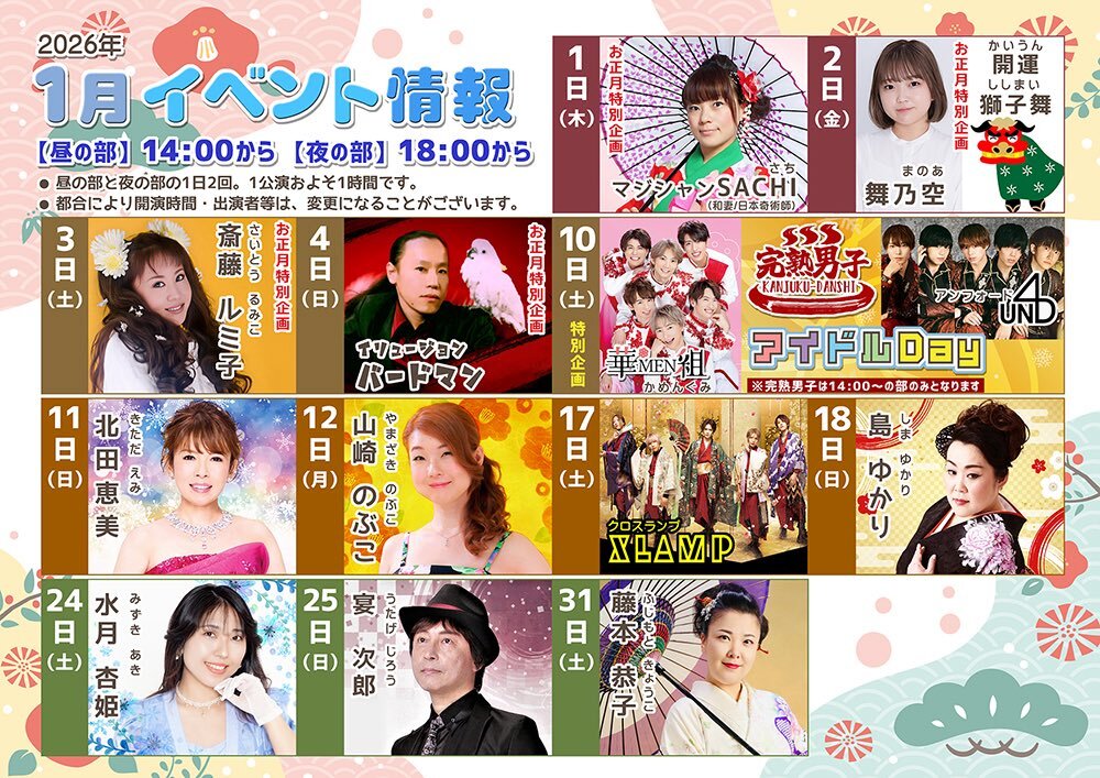 完熟男子イベント(YUITO)『アイドルDay』 SCHEDULE 2026/01/10(土) 『アイドルDay』 ▷1/10(土)▷東京天然温泉 古代の湯〒124-0022 東京都葛飾区奥戸4-2-1▷出演:14:00~14:20▷物販:15:00~16:30▷観覧無料※別途入館料がかかります予めご了承ください URLをコピーする 報告する